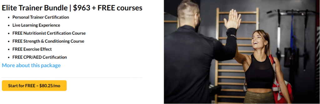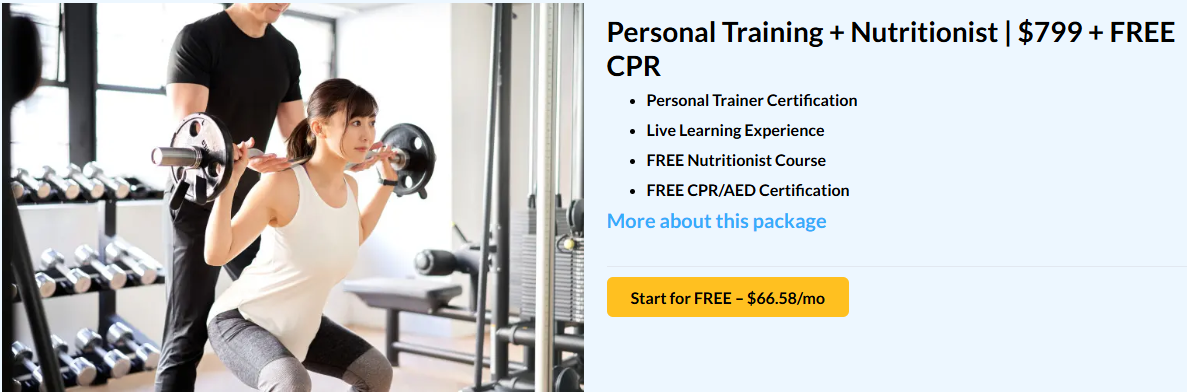 It’s especially ideal for those aiming to build an online coaching business or enter the industry quickly, with a self-paced program that can be completed in 3–10 weeks. The certification is accessible, no college degree required, and includes business and nutrition modules that competitors often charge extra for. At $89 down with 0% interest, it’s one of the most budget-friendly programs. ISSA is NCCA-accredited and offers a job guarantee in the U.S., supported by 10,000+ gym partnerships, making it a solid choice for trainers seeking fast employment and a flexible learning experience.
