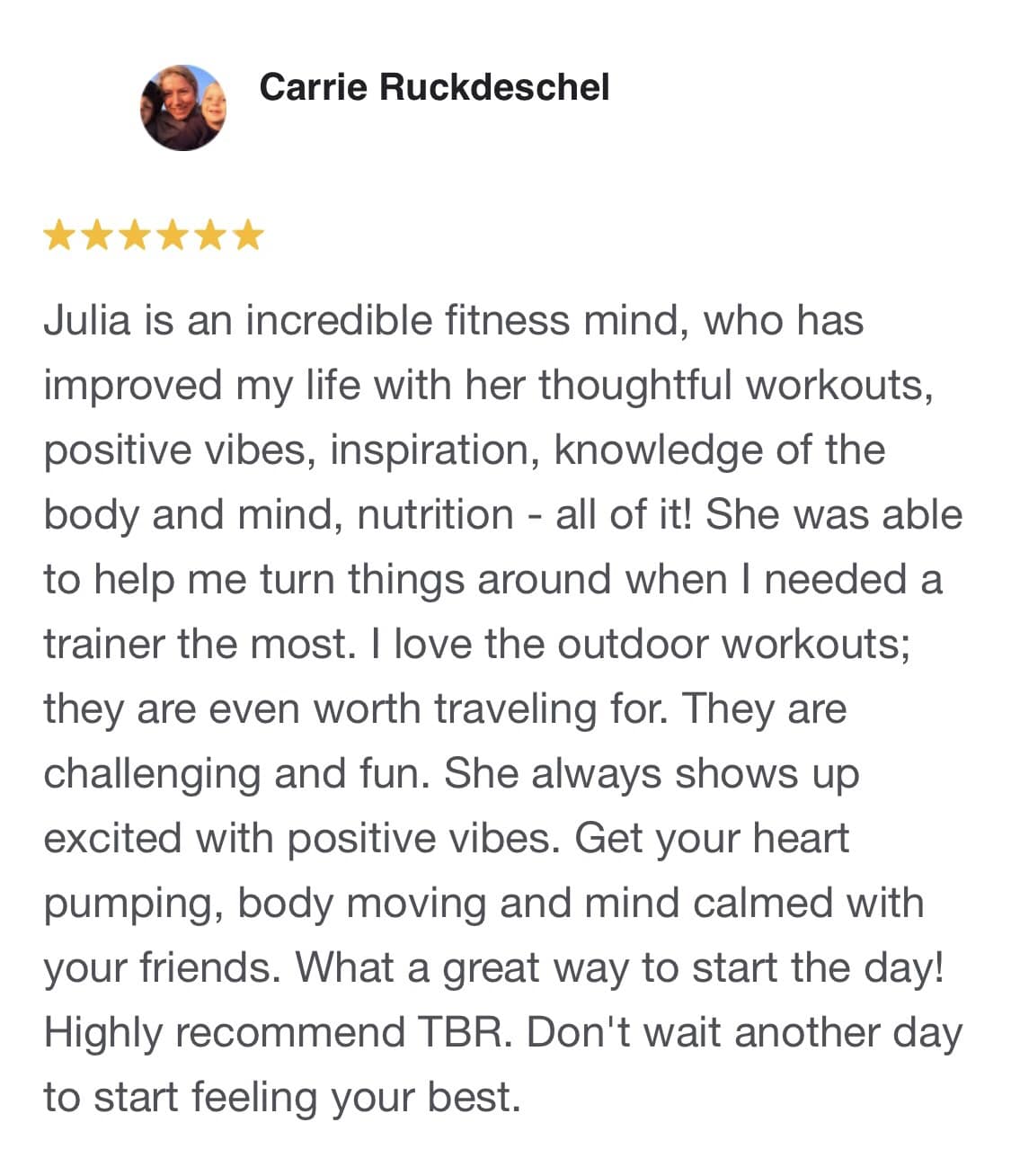 “I tried some at home work out programs but wasn’t seeing the results I wanted. This was one of the best calls I have made for myself and my health. Since being in the program I lost a total of 16 pounds, multiple inches and finally reached my goal weight." -Kim “In March I attended a pool party wearing blue jeans because I was embarrassed of myself. I would not wear shorts, let alone a bikini. And now just 2 months in, I have reached the goal I set for myself and not only that, but I feel better, my clothes fit better, I see muscle tone now, and I will not be wearing blue jeans to any more pool parties this year! I couldn’t have, wouldn’t have done it without Julia. I love that you never do the same workout twice and her cute little sayings run through my head to keep me encouraged.”-Jennifer “I have eliminated much of my neck and back pain, lost inches and I can get into my smaller clothes again. Like most women, I have four sizes in my closet, and I can wear the smaller sizes again. “When I started listening to Julia’s nutrition advice, that’s when I really started losing weight and inches around the middle.” –Michelle “TBR has been outstanding, the experience is much more than I expected, Thank you for your support!! Your program is what I’ve been looking for after everything else (like the gym and the trainers there)!! I lost 25 lbs. and feel great.” –Mike “When I began to train with Julia, my life changed. I had way more energy at work, slept better, felt better and had a much happier outlook on my life. She was able to put a routine together that was achievable and could be worked into my crazy schedule. I have transformed my body loosing 100lbs! I have never felt better about myself and my life!” -Julie